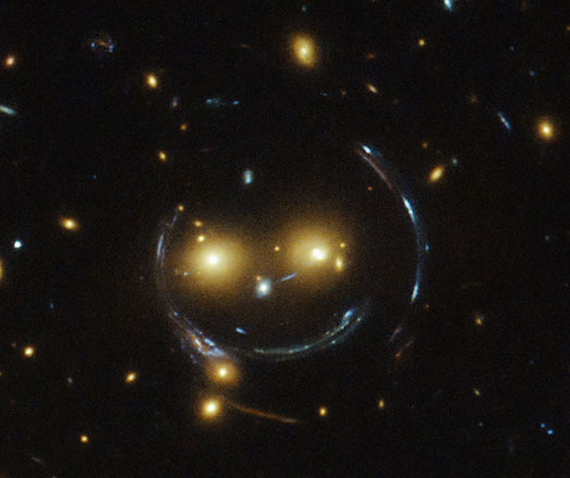Kuvan hehkuvat silmät ovat kirkkaita galakseja, jotka ovat osa SDSS J1038+4849 -nimellä tunnettua galaksijoukkoa. Massiivinen rakenne taivuttaa taaempaa tulevaa valoa ja luo näin galaksien ympärille Einsteinin renkaana tunnetun kuvion.