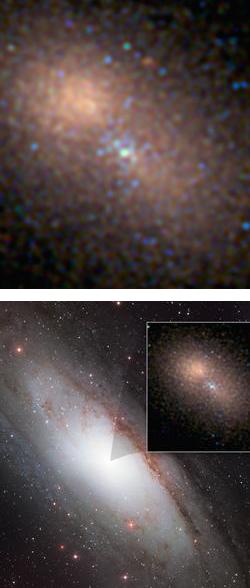 Aivan keskellä olevat siniset tähdet kiertävät galaksin ytimessä olevaa supermassiivista mustaa aukkoa. Tähdet ovat korkeintaan 200 miljoonaa vuotta vanhoja, joten ne eivät ole voineet vaeltaa aukon vierelle kaukaa. Sinisten tähtien uskotaankin syntyneen äkillisessä prosessissa aukon vierellä.