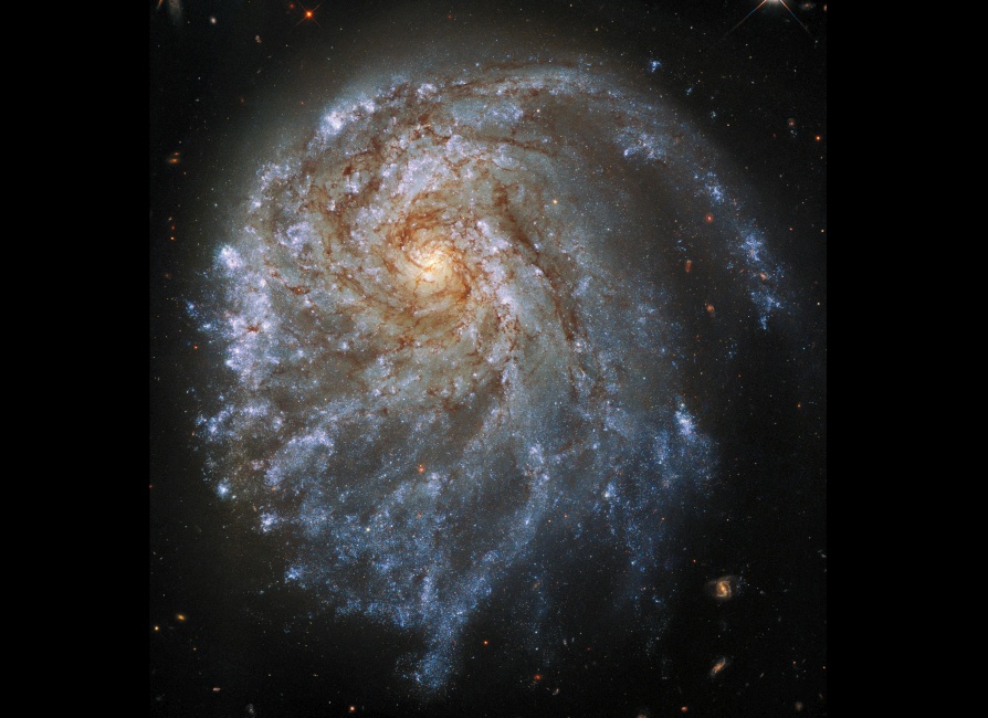Spiraaligalaksissa on parhaillaan voimakasta tähtituotantoa etenkin kuvassa vasemmalla puolella keskustasta olevassa spiraalihaarassa.