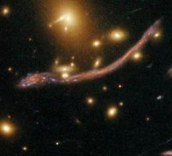 Viereisessä kuvassa varsinainen galaksi näkyy lohikäärmeen pään kohdalla. Painovoimalinssiksi kutsutun ilmiön takia galaksista tuleva valo on kuitenkin venynyt lohikäärmeen hoikaksi vartaloksi.