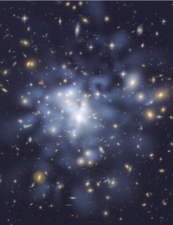 Tutkijat tunnistivat Hubblen kuvista 135 erillistä linssi-ilmiötä 42 taustagalaksista ja laskivat niiden perusteella pimeän aineen paikat. Tuloksena saatu pimeän aineen tiheyskartta on merkitty oheiseen Hubblen näkyvässä valossa ottamaan kuvaan sinisellä värillä.