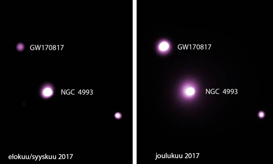 Neutronitähdet ovat supernovina räjähtäneiden tähtien kasaan romahtaneita äärimmäisen tiiviitä jäännöksiä. Nyt havaittavan jälkihehkun synnyttänyt neutronitähtien törmäys todettiin alun perin painovoima-aalloilla elokuun 17. päivä viime vuonna.