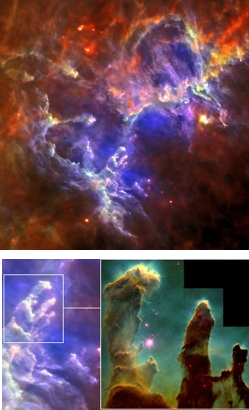 Alkuperäinen Hubble-teleskoopin otos tästä Kotkasumun alueesta on vuodelta 1995 (alempi kuva), ja se on yksi kautta aikojen kuuluisimmista tähtitieteen valokuvista. Kuva otettiin näkyvässä valossa. Herschel sen sijaan havaitsee infrapunavaloa, jonka ansiosta on mahdollista kurkistaa syvemmälle kaasupilvien sisään.