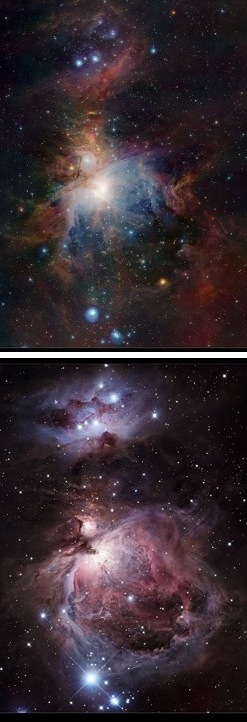 Viereisistä kuvista alempi on vertailukuva, joka on otettu tavallisella näkyvällä valolla. Suurin osa Orionin pilvien valosta tulee vetykaasusta, joka on kuumentunut keskustassa olevien nuorten tähtien ultraviolettisäteilystä. Osa Orionin sumusta on kuitenkin peittynyt pölypilvien taakse.