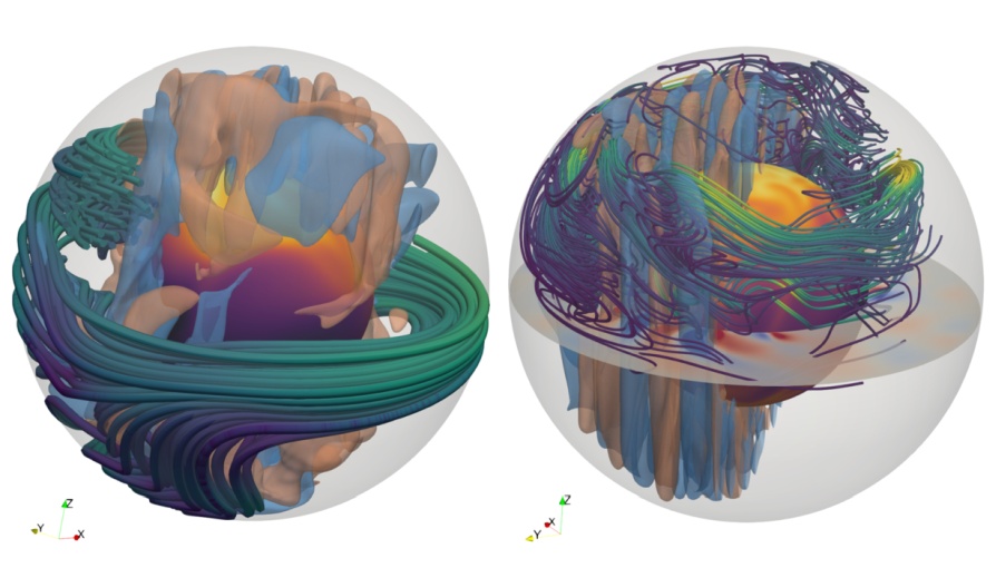 Oheiset simulaatiokuvat esittävät vastasyntyneen neutronitähden sisällä virtaavassa kerroksessa muodostuvan magneettikentän viivoja.