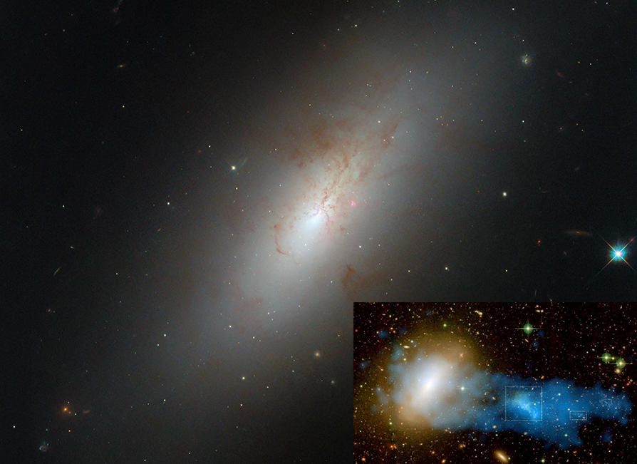 Kolaroinnin aiheuttaman häiriön seurausta ovat myös yllä isommassa kuvassa näkyvät punaruskeat pölypilvet NGC 4694:n kiekossa.