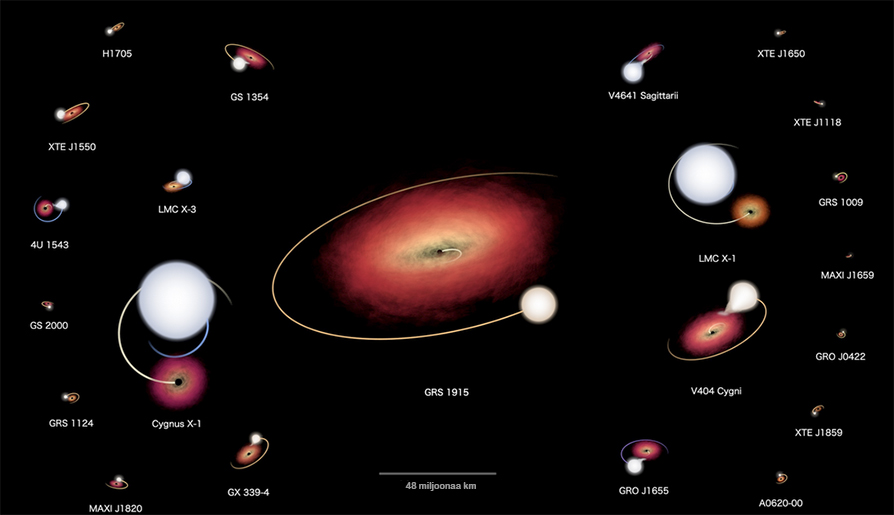 Videon mustat aukot sijaitsevat omassa galaksissamme ja lähimmässä naapurigalaksissa Magellanin pilvessä. Kaikkia aukkoja kiertää niille materiaa syöttävä kumppanitähti.