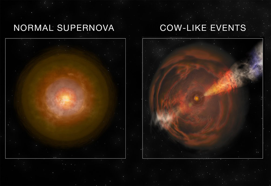 Normaaleista supernovista poiketen Cow-tapahtumissa räjähdyksessä syntyvä musta aukko tai neutronitähti on hyvin aktiivinen. Se ei myöskään ole aineksen verhoama.