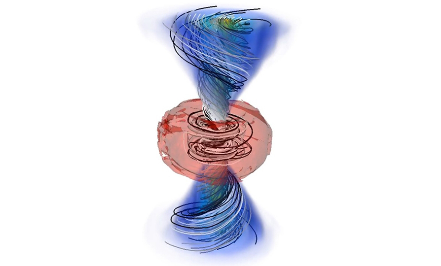 Uusissa simulaatioissa törmäyksessä yhdistyneiden neutronitähtien ympärille muodostuu rengas, josta kapea gammasäteilyn nauha ampaisee vastakkaisiin suuntiin. Tämä säteily löytää tiensä ulos tähtien magneettikenttien ohjailemana pyörteenä.