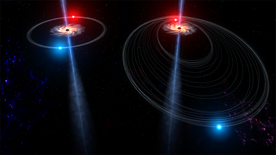 Syynä tähän on potku, jonka tapahtumassa vapautuvat painovoima-aallot antavat yhdistyneelle aukolle. Se lähettää aukon liikkeelle valtavalla, jopa tuhansien kilometrien sekuntinopeudella, mikä puolestaan muuttaa galaksin ytimen tähtien pyöreät radat soikeammiksi.