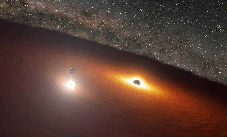 Kahdesti 12 vuoden jaksossa pienempi musta aukko kulkee kookkaampaa kumppaniaan kiertävän kaasukiekon läpi. Tapahtuma synnyttää purkauksen, joka on kirkkaampi kuin koko Linnunratamme.