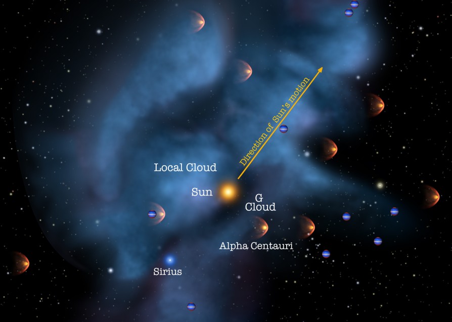 Aurinko liikkuu noin 22 kilometrin sekuntinopeudella ympäröivään tähtienvälisen aineen pilveen verrattuna. Vauhti saa aikaan vaikutelman, jossa paikallaankin olevat hiukkaset näyttävät siirtyvän liikkeessä olevan havaitsijan suhteen. Hiukkasilla on kuitenkin myös oma liikkeensä. Tällä hetkellä tähtienväliset hiukkaset näyttävät tulevan Käärmeenkantajan tähdistön suunnalta.