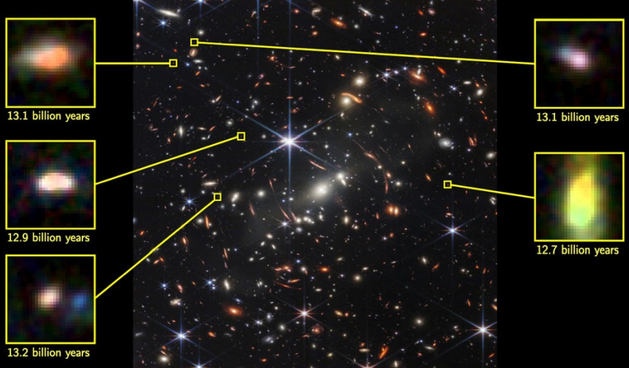 Oheinen kuva julkaistiin viime heinäkuussa osana James Webb -teleskoopin ensimmäisiä tiedekuvia. Jo tuolloin huomattiin, että kuvan kauimmaiset galaksit vaikuttivat tähtimääränsä suhteen massiivisemmilta kuin olisi odotettu. Uusi tutkimus arvioi massoja uudelleen eri menetelmällä.