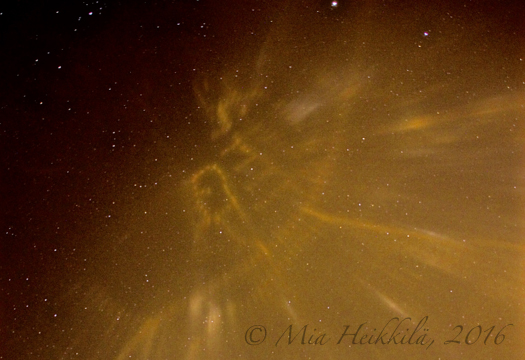 Heikkilä oli tiistaina hieman ennen kymmentä koiran kanssa lenkillä. Hän havaitsi taivaalla pilarimaisia säteitä, joita hän ensi alkuun epäili revontuliksi, mutta mietti sitten muita selityksiä.
