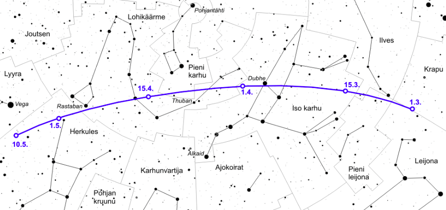 Komeettojen näkymisestä lisää Tähdet ja avaruus -lehdessä no 1/2017. Seuraamme pyrstötähtien näkymistä pitkin kevättä.