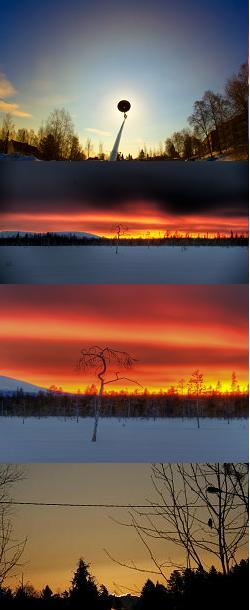 Tulivuoriruskot (keskellä kuvasarjaa) liittyvät Eyjafjalla-jäätikön ensimmäiseen purkaussarjaan, joka alkoi maaliskuun 20.-21. päivän kohdalla. Tulivuoriruskon tunnistaa voimakkaan punaisista ja -oransseista sävyistä. Kuvat otti Sauli Koski illalla 22.3. Kittilässä.