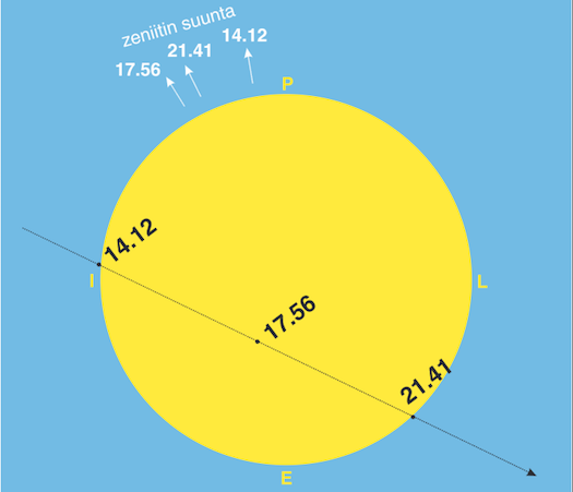 Ylikulku alkaa kello 14.12 ja päättyy kello 21.41. Pimennyksen viimeiset hetket nähdään vain pohjoisessa Suomessa, sillä muualla Aurinko ehtii laskea tätä ennen. Merkurius on lähinnä Auringon keskiosaa kello 17.56, mutta mitään erityistä huippuhetkeä ylikululla ei ole.
