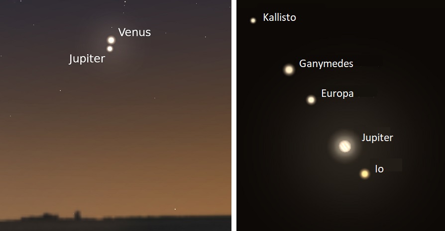 Kohtaaminen on upea jo paljain silmin nähtynä, mutta siitä saa vielä lisää irti kiikarilla, jolloin Jupiterin ympäriltä voi erottaa sen suurimmat kuut. Kuut ovat lähimmän kohtaamisen aikaan rivissä siten, että Jupiterin oikealla eli länsipuolella on Io, ja vasemmalla eli itäpuolella ovat Europa, Ganymedes ja Kallisto.