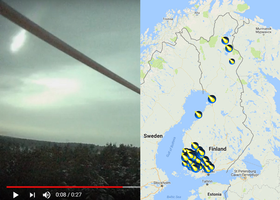 Vain muutaman sekunnin kestänyt valoilmiö nähtiin Pohjois-Lappia myöten (ks. ajantasainen kartta). Eniten havaintoja saapui Lounais-Suomesta, luultavasti koska siellä oli selkein sää tapahtuman aikaan.